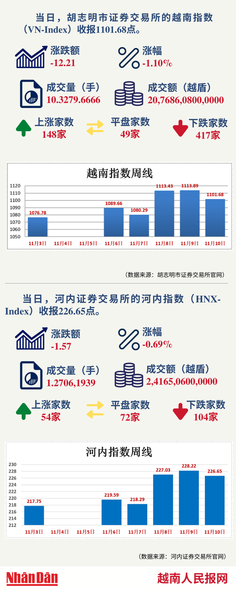 当天,胡志明市证券交易所的越南指数(VN-Index)和河内证券交易所的河内指数(HNX-Index)分别收报1101.68点和226.65点。