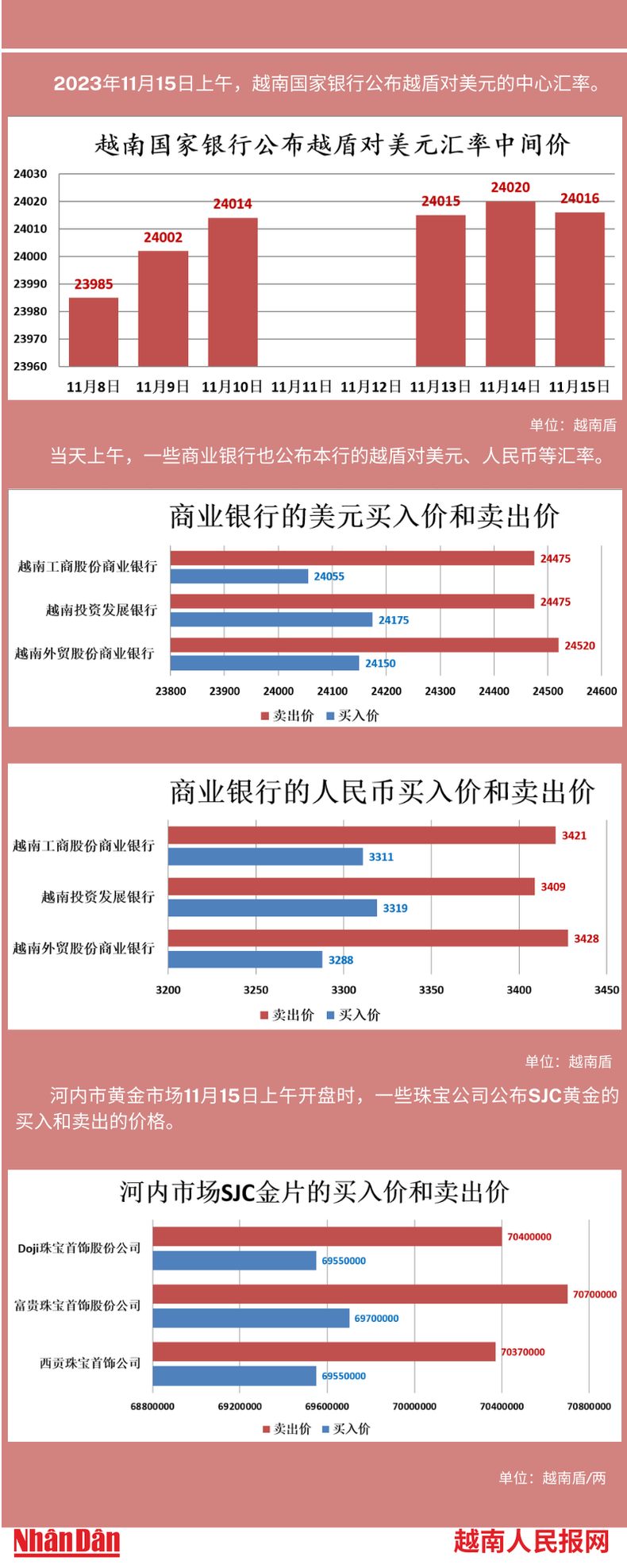 2023年11月15日上午,越南国家银行所公布的越盾对美元的中心汇率为24016。