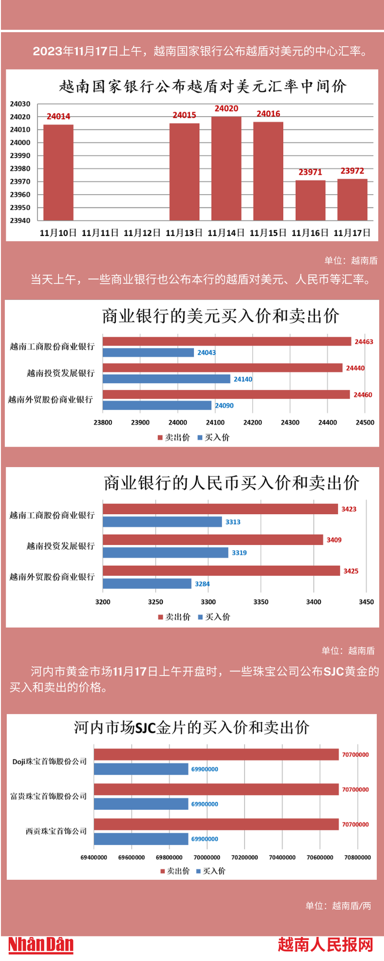 2023年11月17日上午,越南国家银行所公布的越盾对美元的中心汇率为23972。