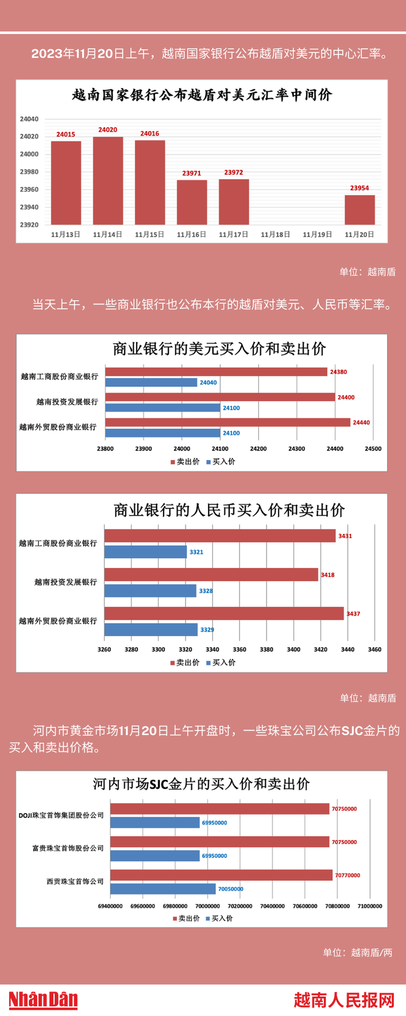 2023年11月20日上午,越南国家银行所公布的越盾对美元的中心汇率为23954。
