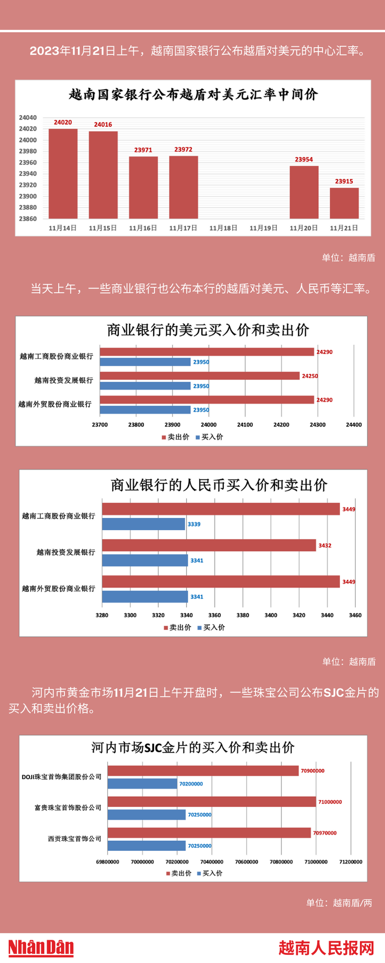 2023年11月21日上午,越南国家银行所公布的越盾对美元的中心汇率为23915。