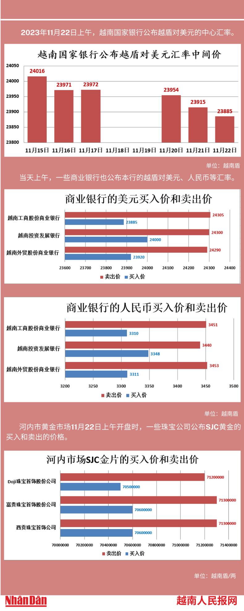 2023年11月22日上午,越南国家银行所公布的越盾对美元的中心汇率为23885。