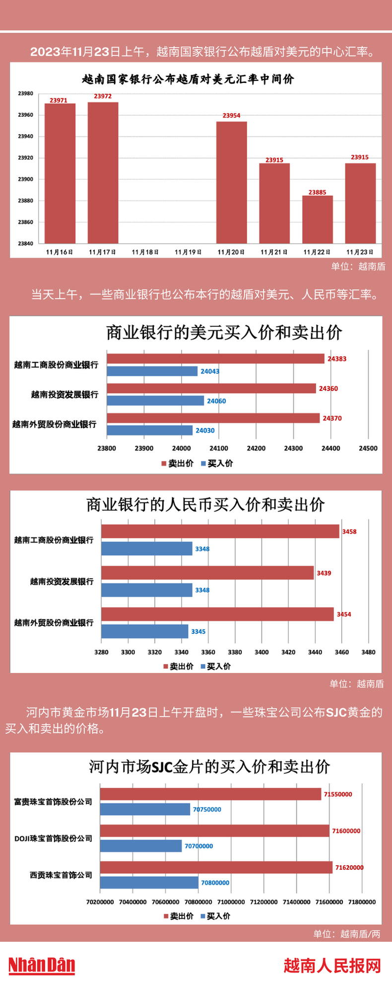 2023年11月23日上午,越南国家银行所公布的越盾对美元的中心汇率为23915。