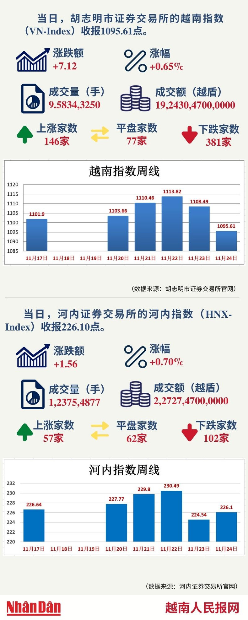 当天,胡志明市证券交易所的越南指数(VN-Index)和河内证券交易所的河内指数(HNX-Index)分别收报1095.61点和226.10点。