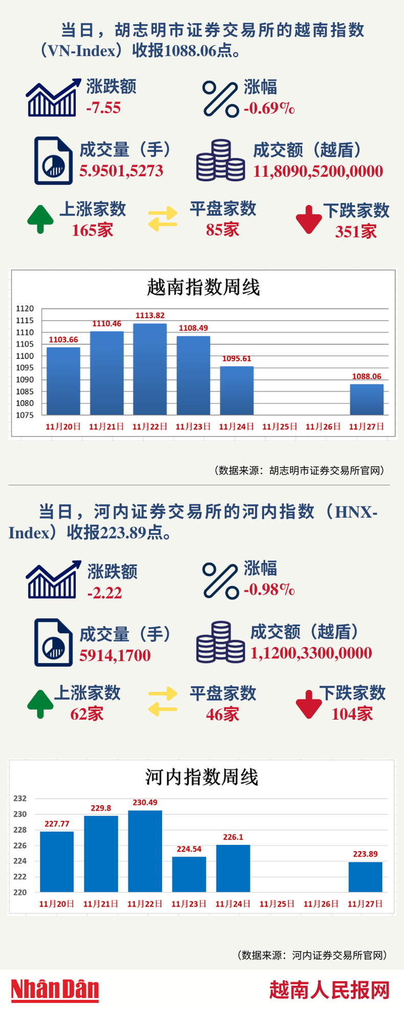 当天,胡志明市证券交易所的越南指数(VN-Index)和河内证券交易所的河内指数(HNX-Index)分别收报1088.06点和223.89点。