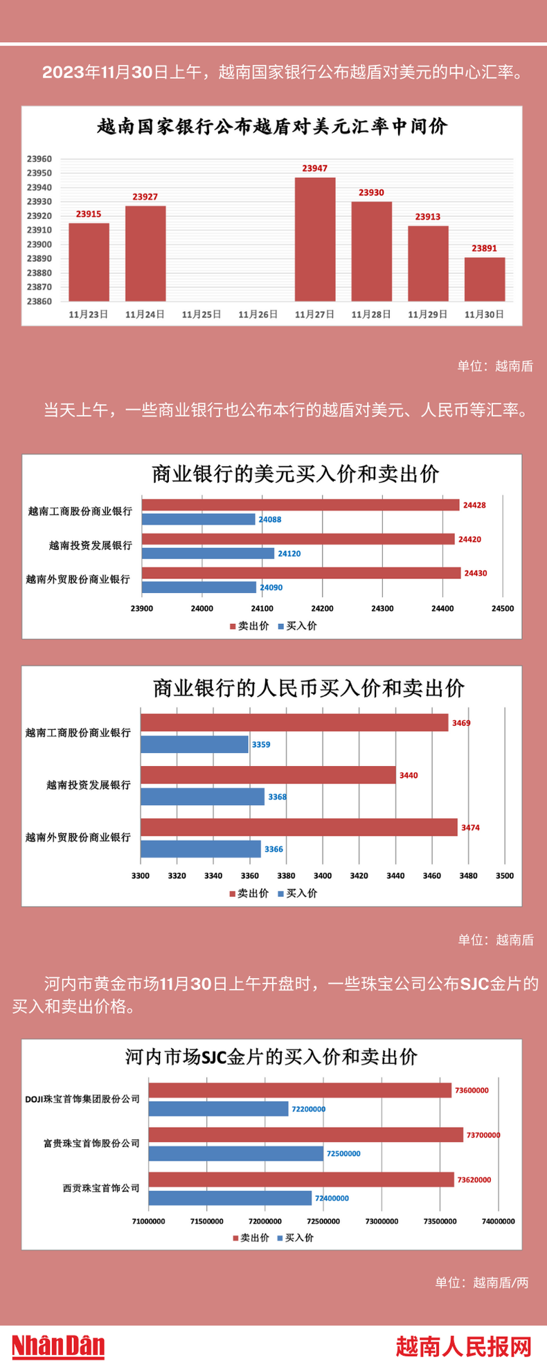 2023年11月30日上午,越南国家银行所公布的越盾对美元的中心汇率为23891。