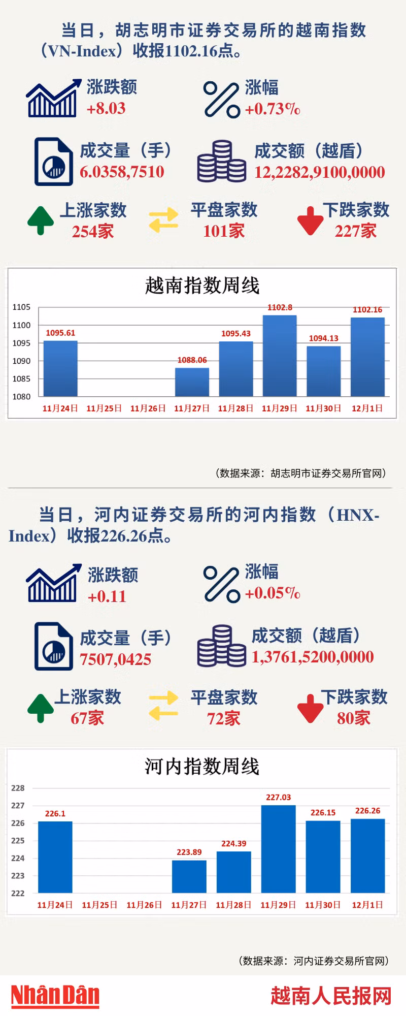 当天,胡志明市证券交易所的越南指数(VN-Index)和河内证券交易所的河内指数(HNX-Index)分别收报1102.16点和226.26点。