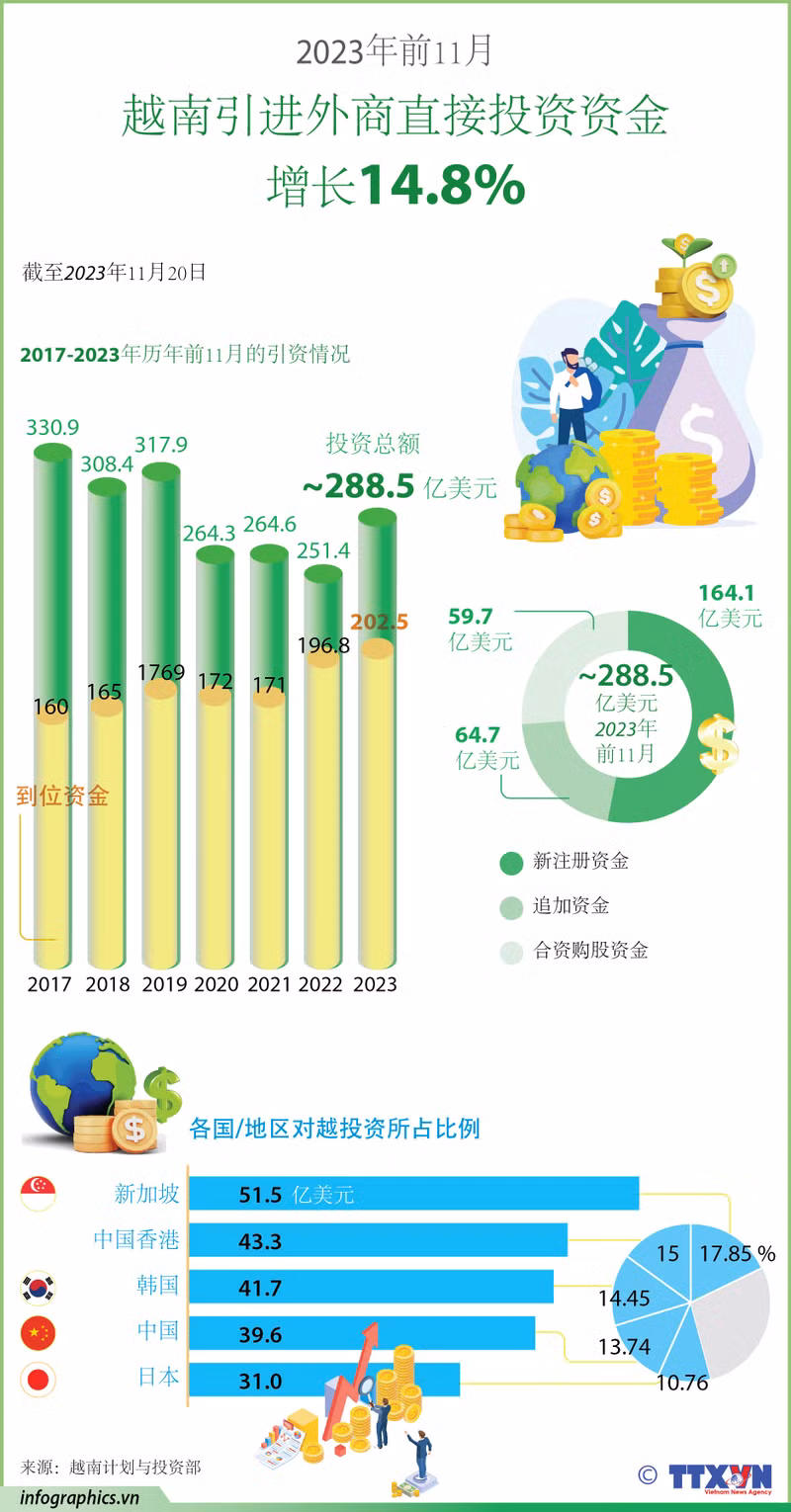 据越南计划与投资部关于吸引外商直接投资资金情况的报告,截至2023年11月20日,外商直接投资新签、增资和融资购买股份总额达近288.5亿美元,同比增长14.8%,较前10个月小幅上升0.1个百分点。