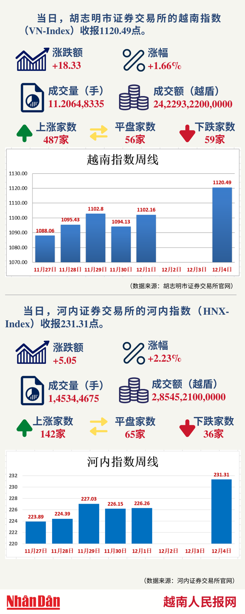 当天,胡志明市证券交易所的越南指数(VN-Index)和河内证券交易所的河内指数(HNX-Index)分别收报1120.49点和231.31点。