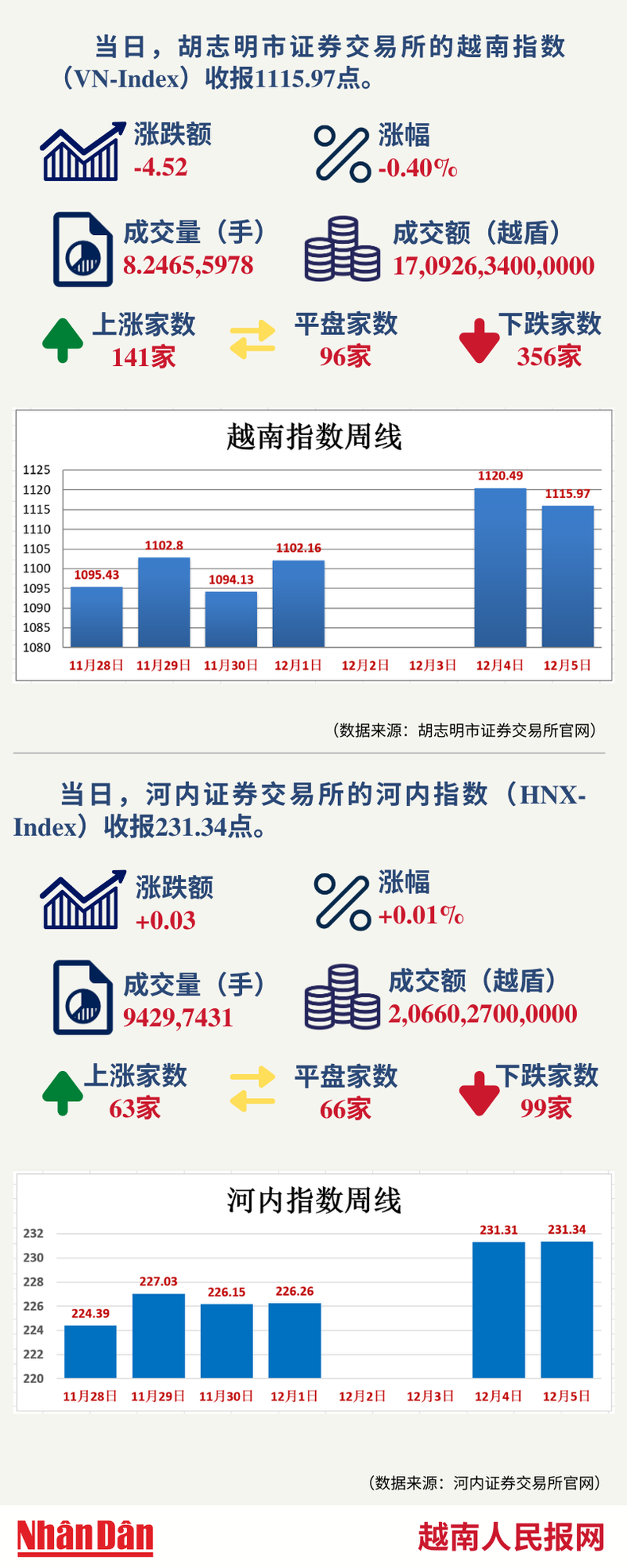 当天,胡志明市证券交易所的越南指数(VN-Index)和河内证券交易所的河内指数(HNX-Index)分别收报1115.97点和231.34点。
