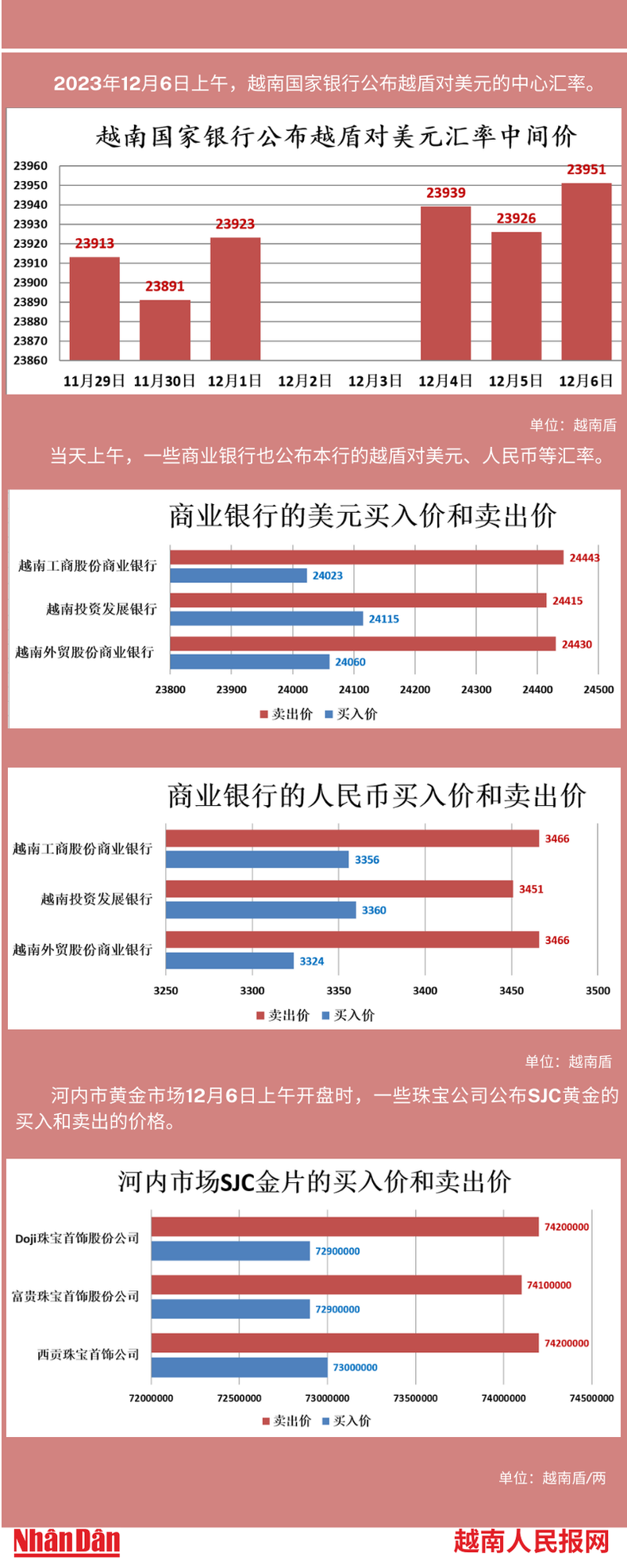 2023年12月6日上午,越南国家银行所公布的越盾对美元的中心汇率为23951。