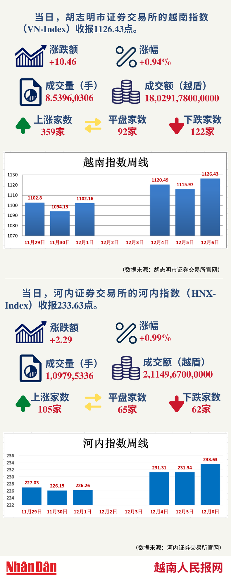 当天,胡志明市证券交易所的越南指数(VN-Index)和河内证券交易所的河内指数(HNX-Index)分别收报1126.43 点和231.34点。