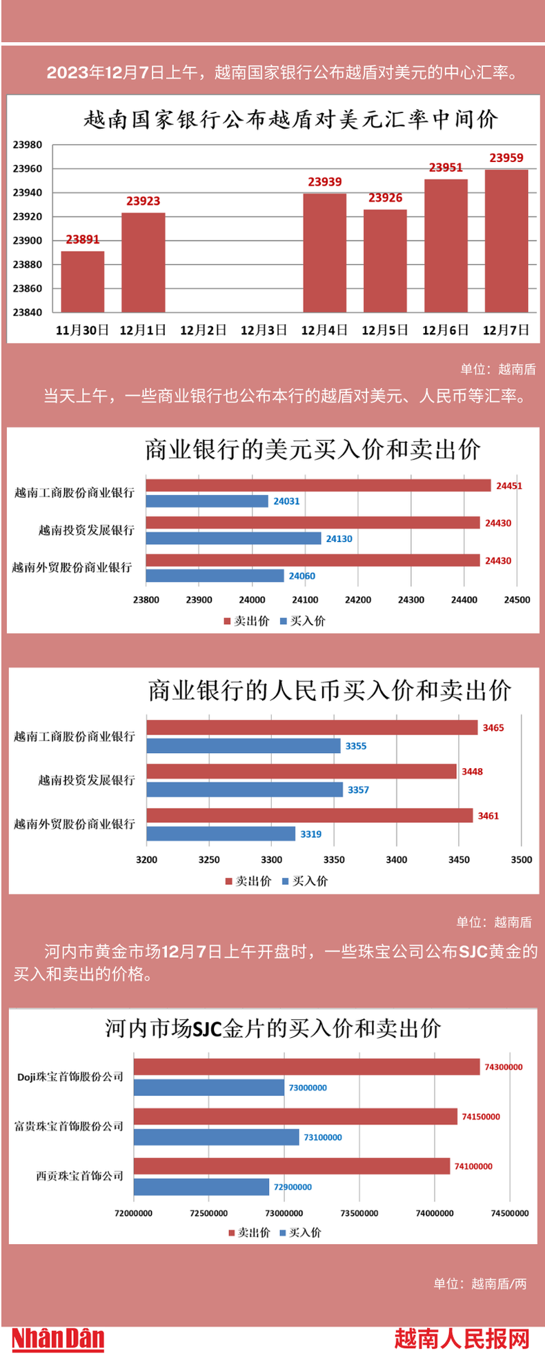 2023年12月7日上午,越南国家银行所公布的越盾对美元的中心汇率为23959。