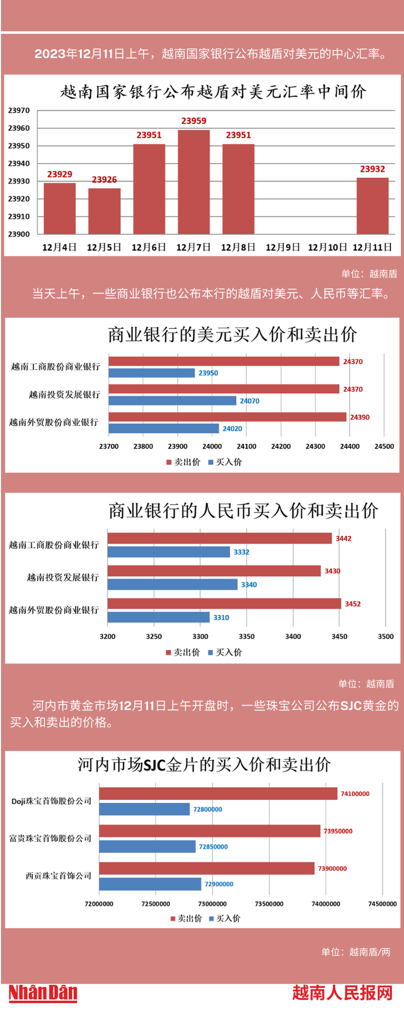 2023年12月11日上午,越南国家银行所公布的越盾对美元的中心汇率为23932。