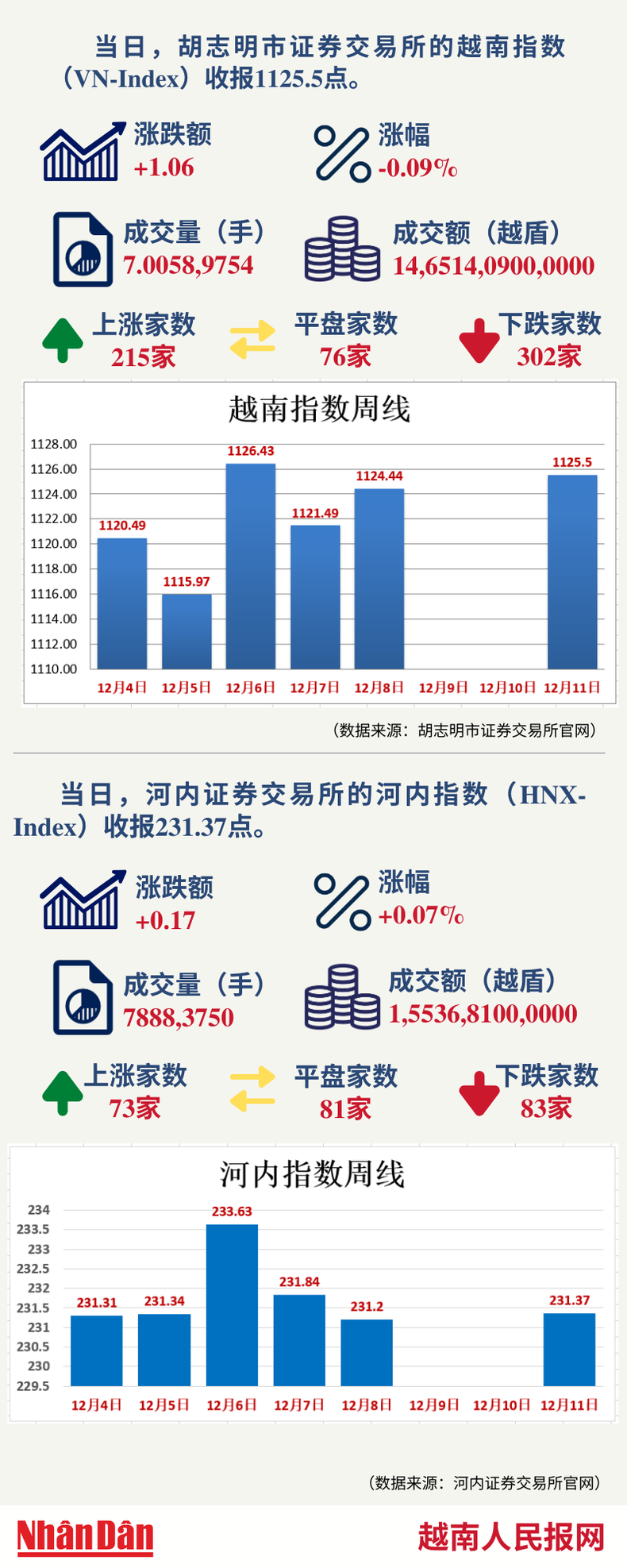 当天,胡志明市证券交易所的越南指数(VN-Index)和河内证券交易所的河内指数(HNX-Index)分别收报1125.5点和231.37点。