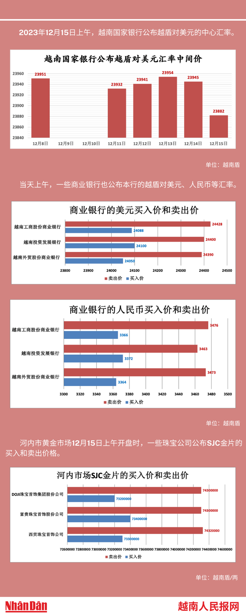 2023年12月15日上午,越南国家银行所公布的越盾对美元的中心汇率为23882。