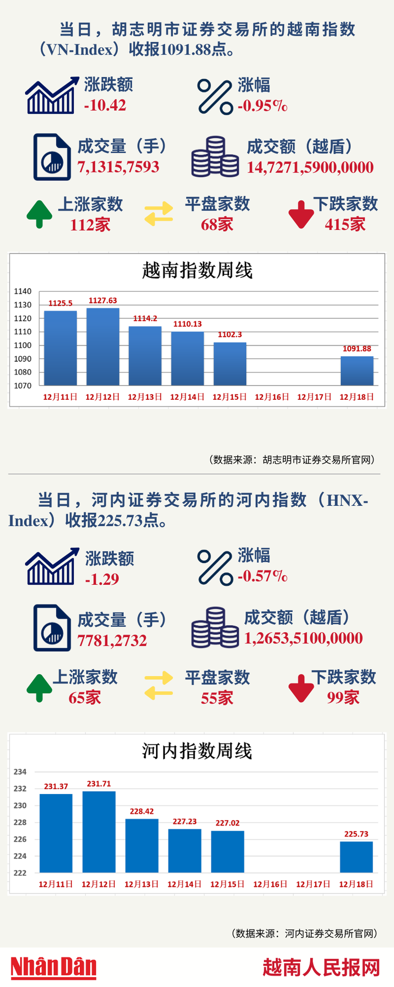 当天,胡志明市证券交易所的越南指数(VN-Index)和河内证券交易所的河内指数(HNX-Index)分别收报1091.88点和225.73点。