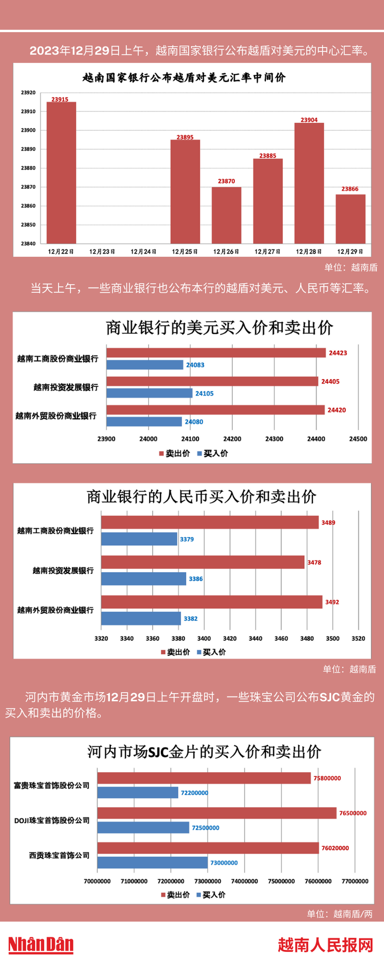 2023年12月29日上午,越南国家银行所公布的越盾对美元的中心汇率为23866。