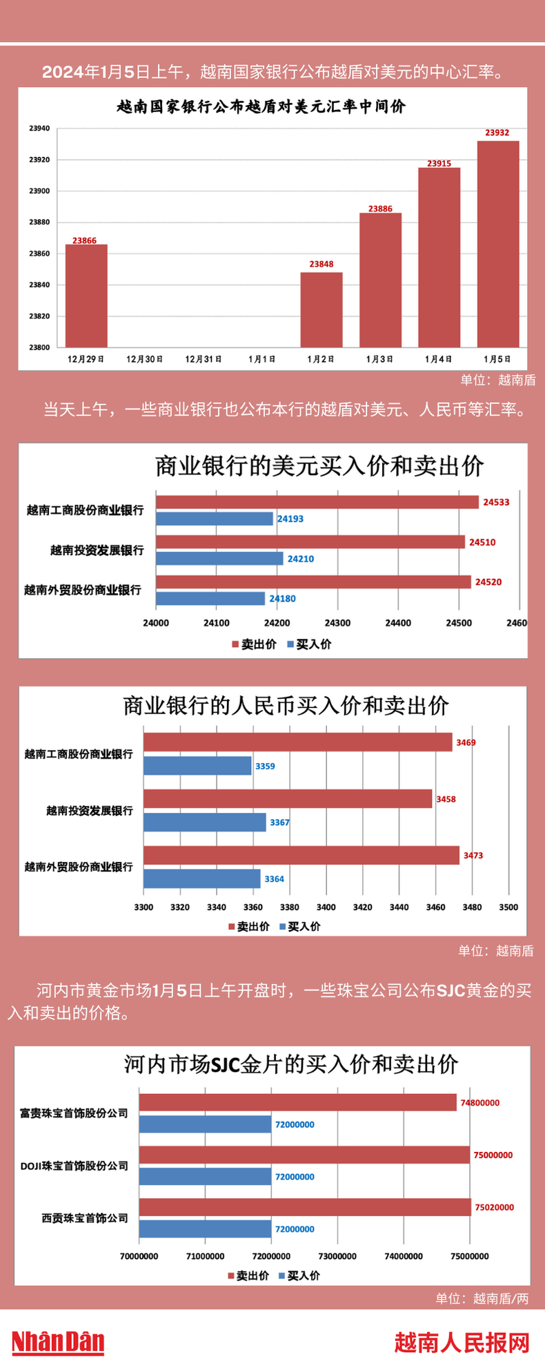 2024年1月5日上午,越南国家银行所公布的越盾对美元的中心汇率为23932。