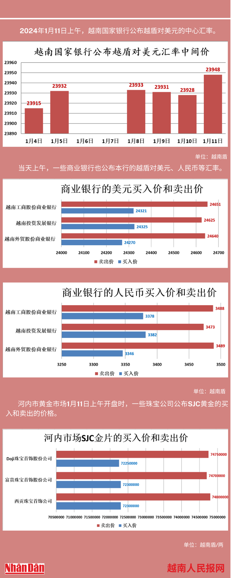 2024年1月11日上午,越南国家银行所公布的越盾对美元的中心汇率为23948。