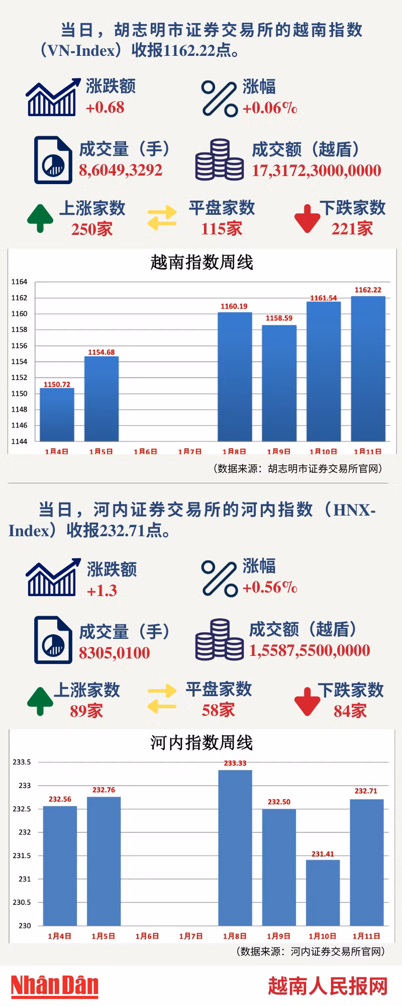 当天,胡志明市证券交易所的越南指数(VN-Index)和河内证券交易所的河内指数(HNX-Index)分别收报1158.59点和232.50点。