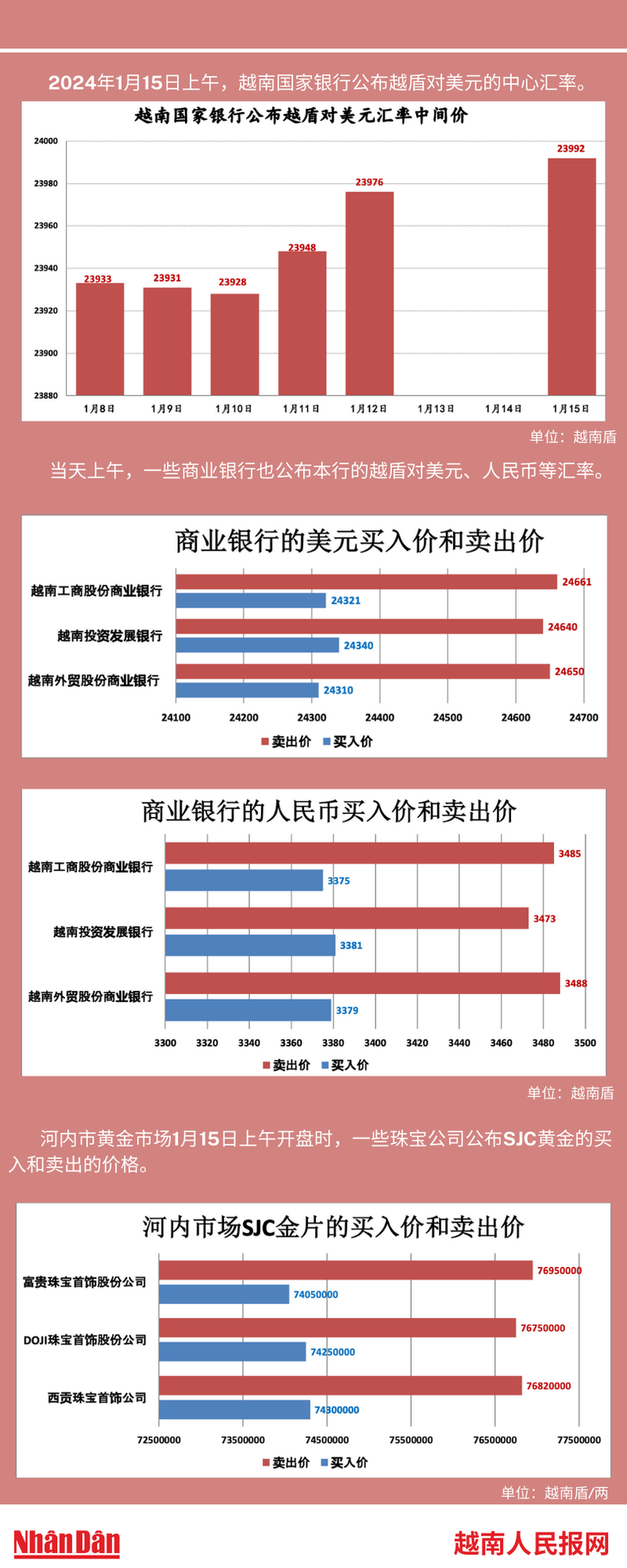 2024年1月15日上午,越南国家银行所公布的越盾对美元的中心汇率为23992。