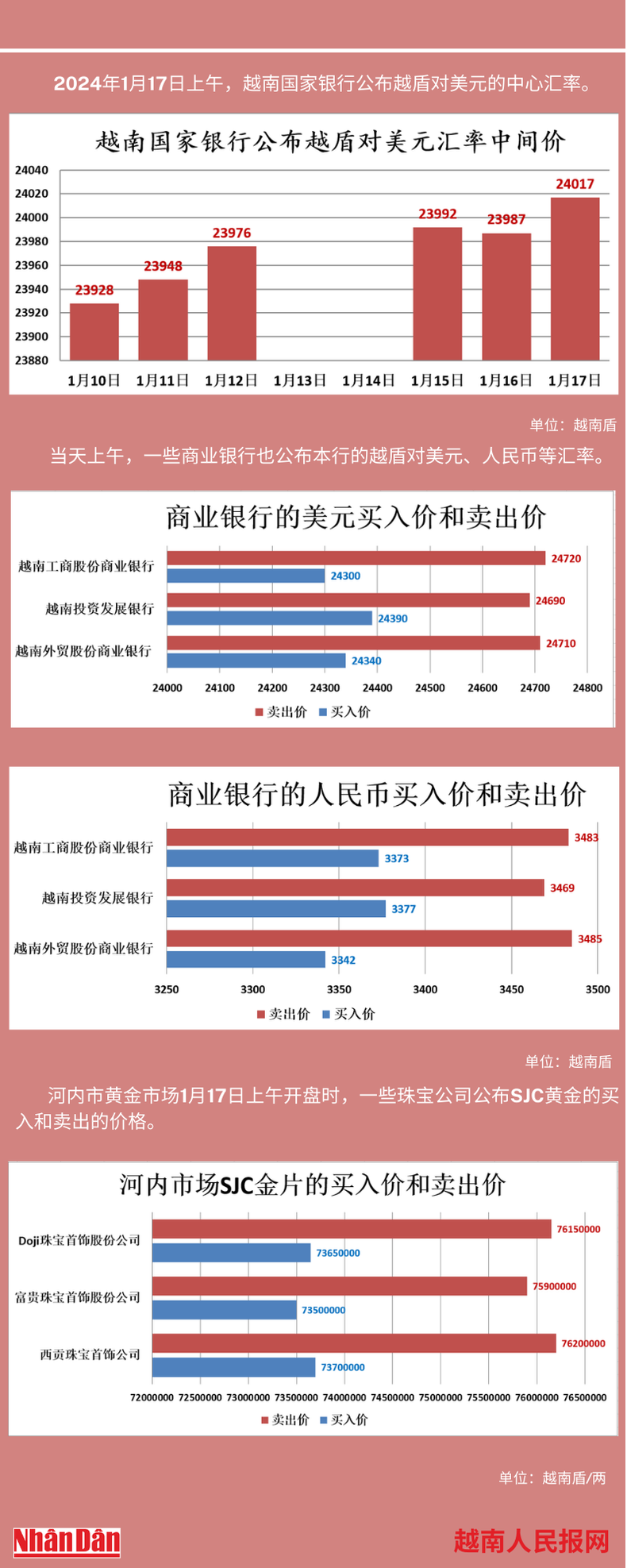 2024年1月17日上午,越南国家银行所公布的越盾对美元的中心汇率为24017。