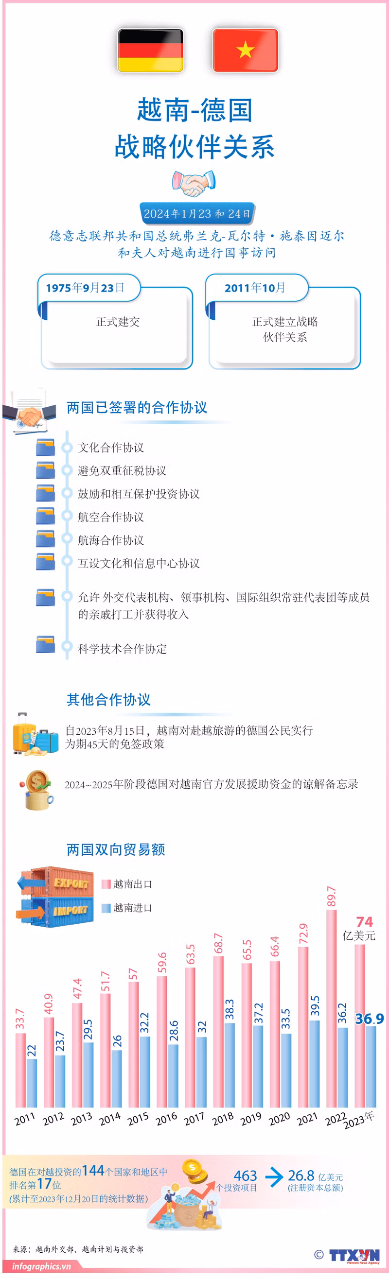 应越南国家主席武文赏及夫人的邀请,德意志联邦共和国总统弗兰克-瓦尔特·施泰因迈尔和夫人从1月23日-24日对越南进行国事访问。