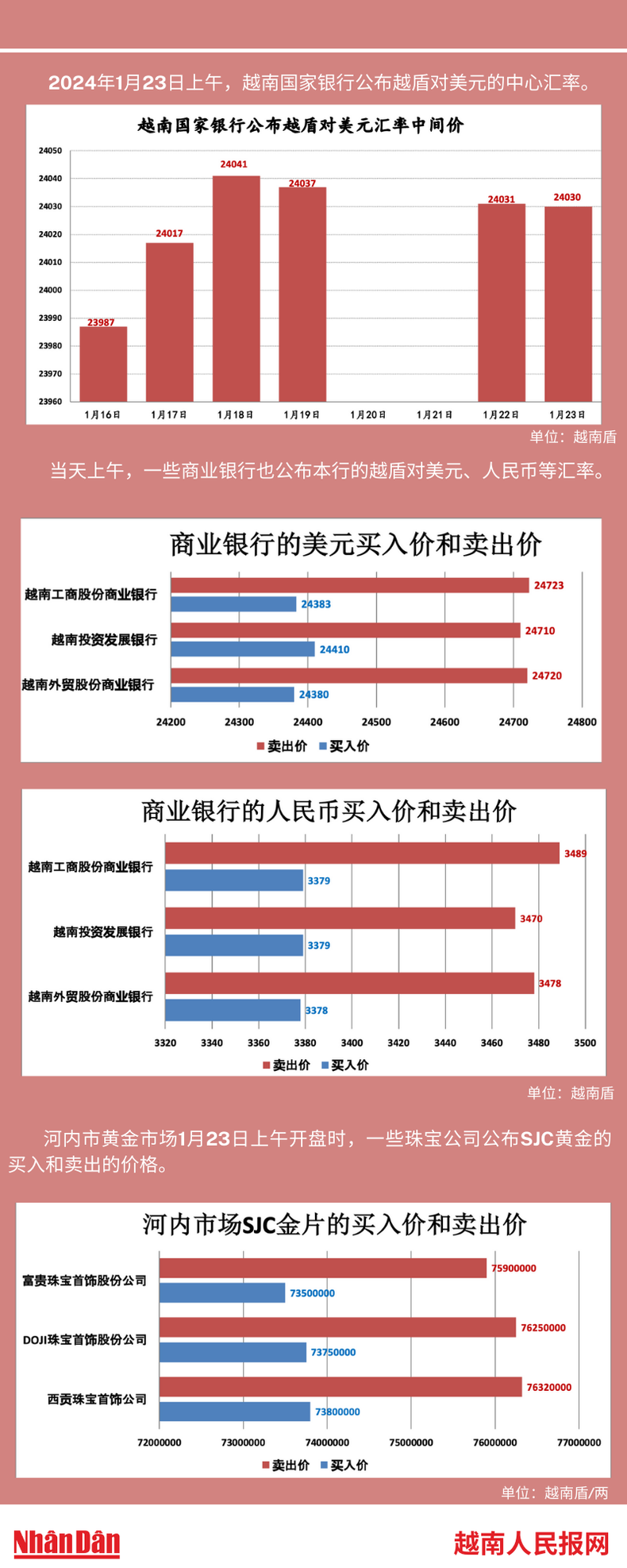 2024年1月23日上午,越南国家银行所公布的越盾对美元的中心汇率为24030。