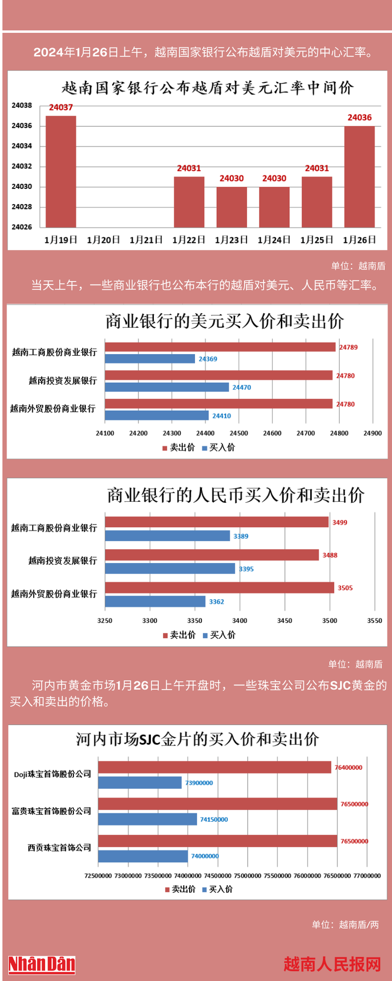 2024年1月26日上午,越南国家银行所公布的越盾对美元的中心汇率为24036。