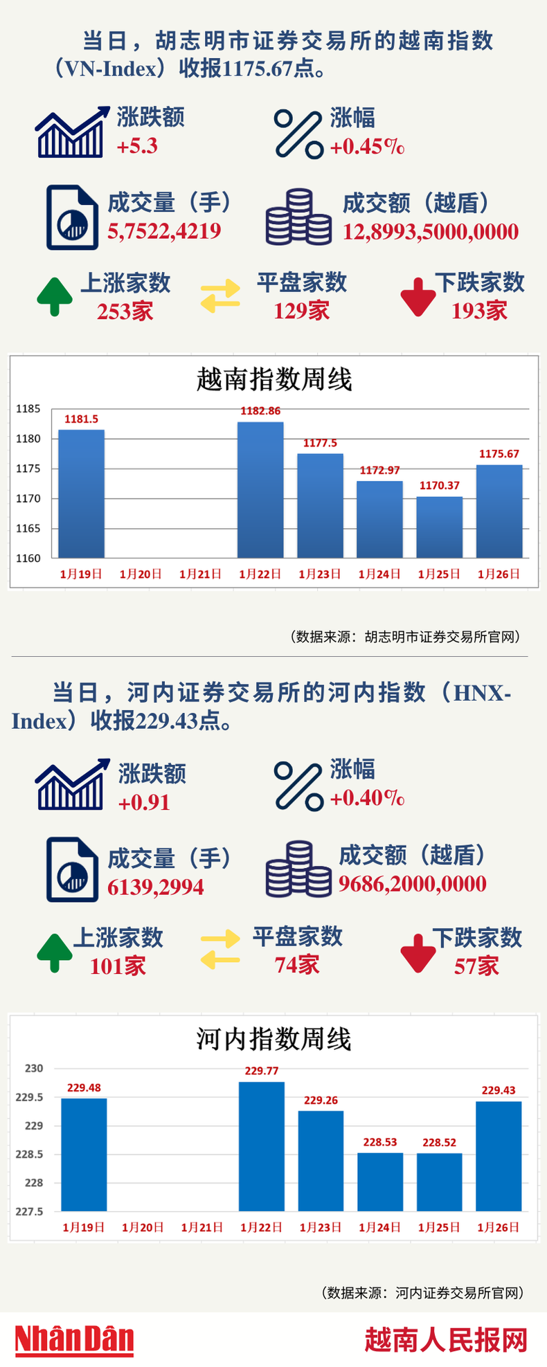 当天,胡志明市证券交易所的越南指数(VN-Index)和河内证券交易所的河内指数(HNX-Index)分别收报1175.67点和229.43点。