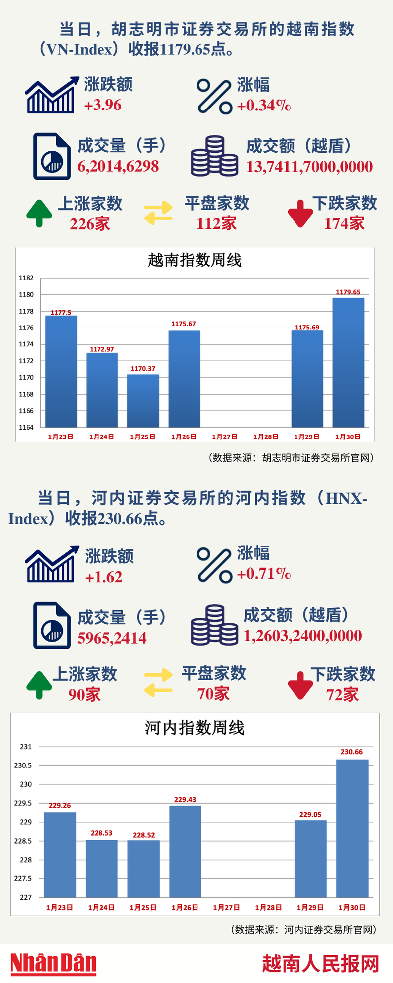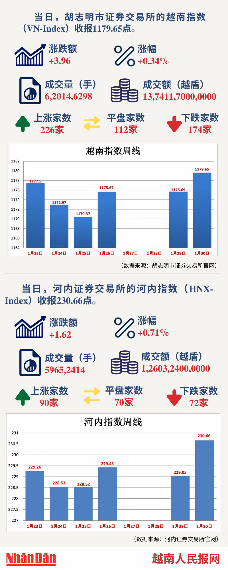当天,胡志明市证券交易所的越南指数(VN-Index)和河内证券交易所的河内指数(HNX-Index)分别收报1179.65点和230.66点。