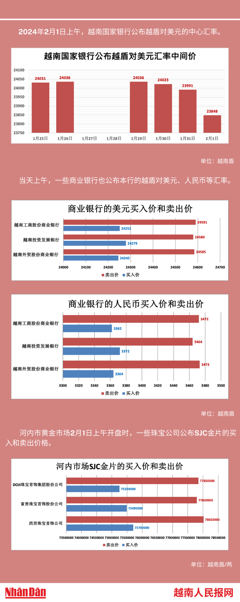 2024年2月1日上午,越南国家银行所公布的越盾对美元的中心汇率为23848。