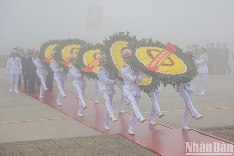 | 党和国家代表团的花圈飘带上写着“永远铭记伟大胡志明主席的功劳”。 |