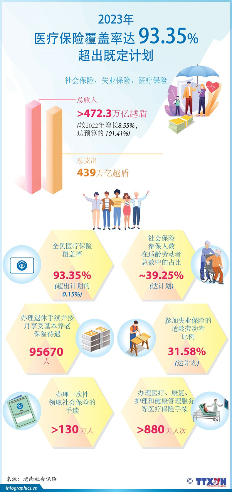 2023年,越南保险行超额完成有关社会保险、失业保险、医疗保险覆盖率等的既定目标,其中,医疗保险覆盖率为93.35,与既定目标相差0.15%。
