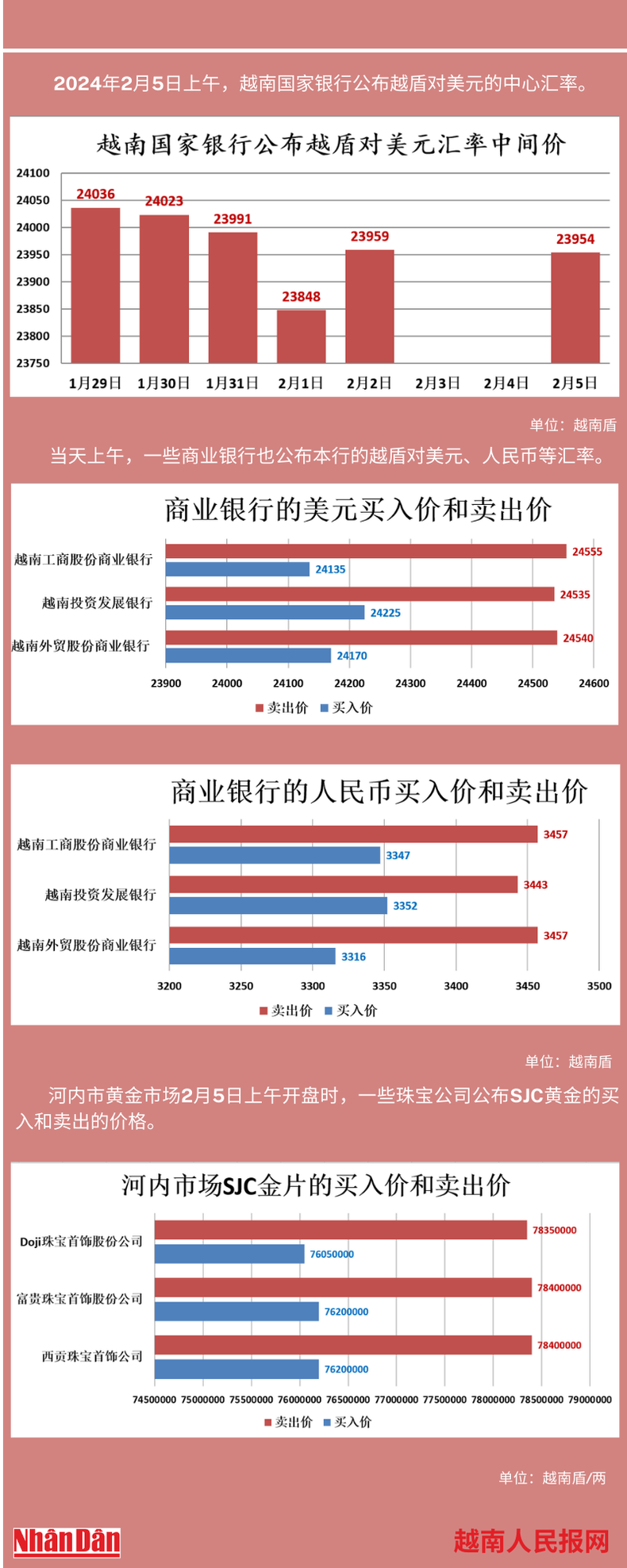 2024年2月5日上午,越南国家银行所公布的越盾对美元的中心汇率为23954。