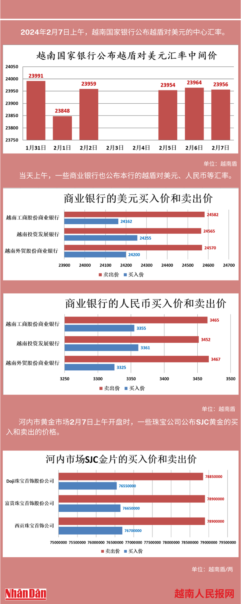 2024年2月7日上午,越南国家银行所公布的越盾对美元的中心汇率为23956。