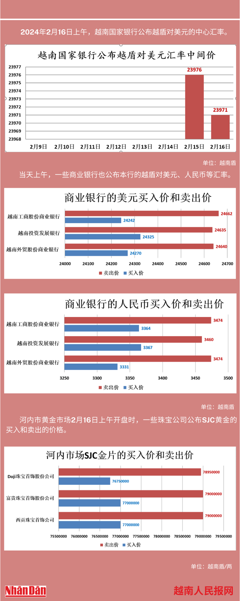 2024年2月16日上午,越南国家银行所公布的越盾对美元的中心汇率为23971。