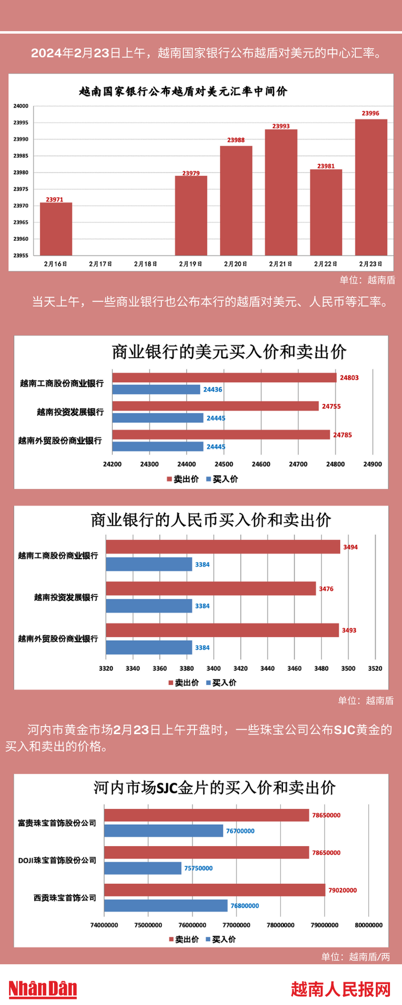 2024年2月23日上午,越南国家银行所公布的越盾对美元的中心汇率为23996。