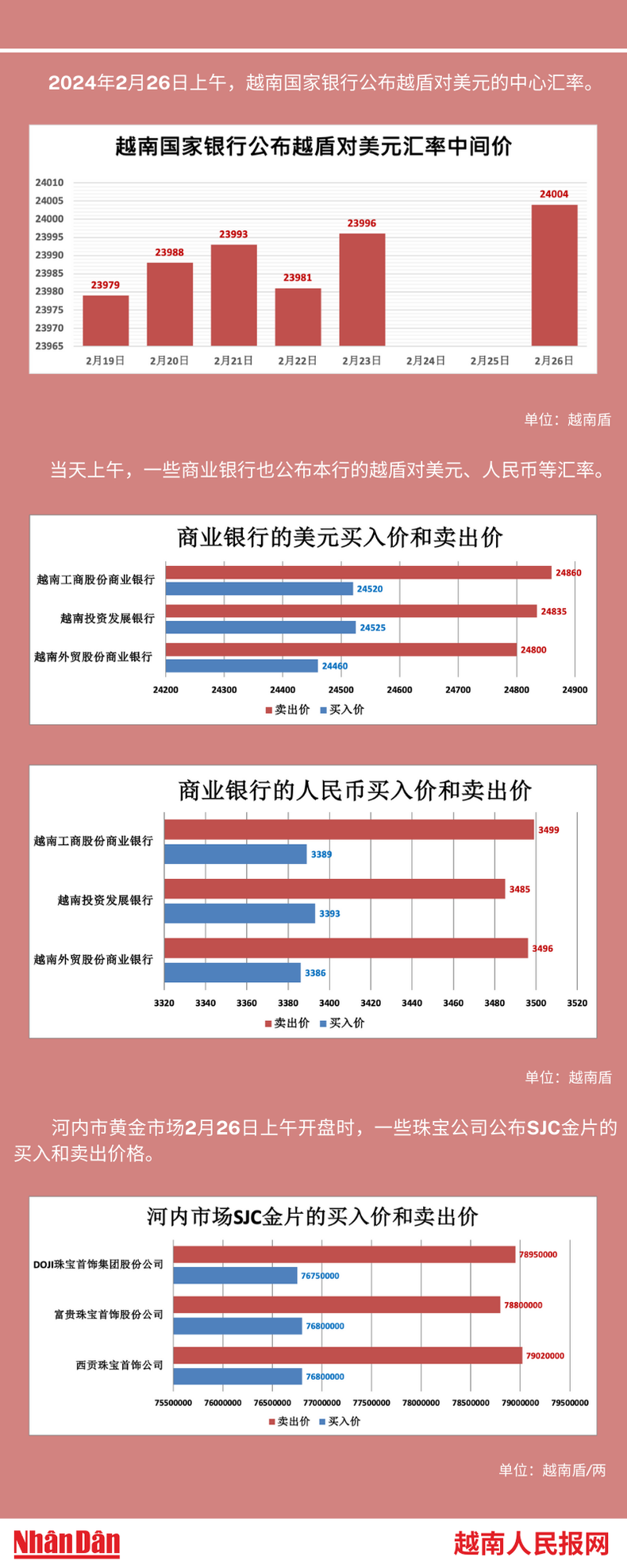 2024年2月26日上午,越南国家银行所公布的越盾对美元的中心汇率为24004。