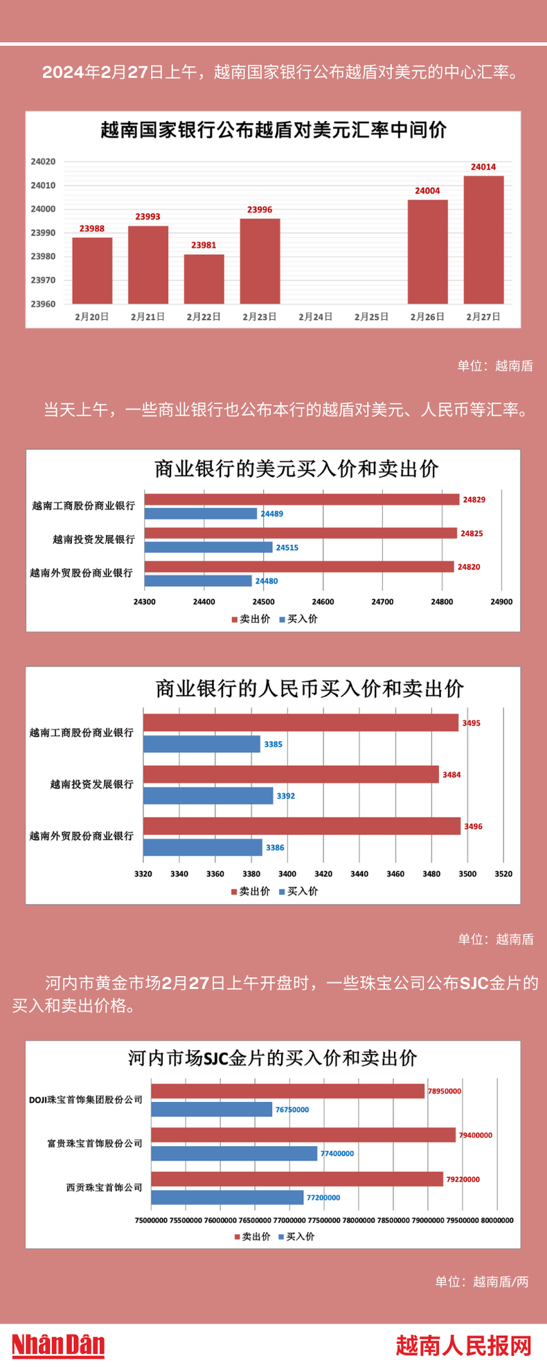 2024年2月27日上午,越南国家银行所公布的越盾对美元的中心汇率为24014。