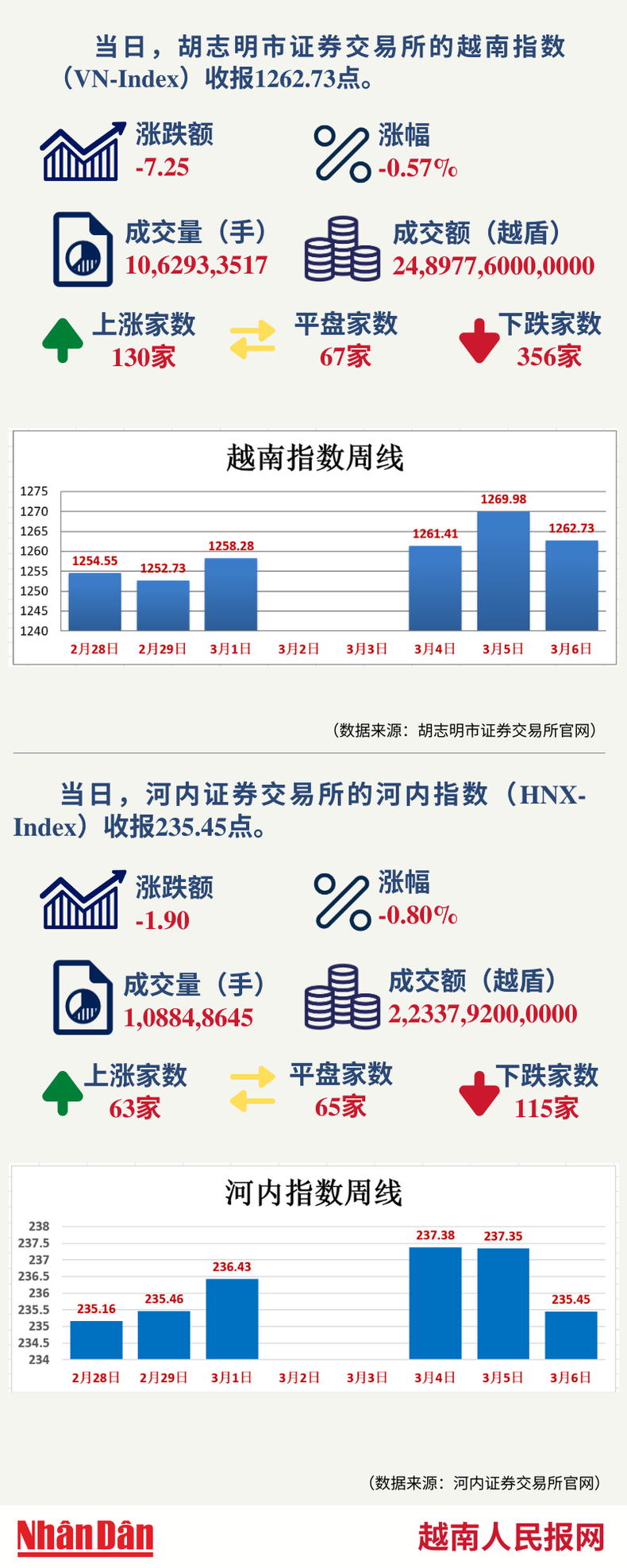 2025年12月08日星期一 16:50 12月8日越南证券市场数据一览 【图表新闻】 当天,胡志明市证券交易所的越南指数(VN-Index)和河内证券交易所的河内指数(HNX-Index)分别收报1741.32点和260.65点。
