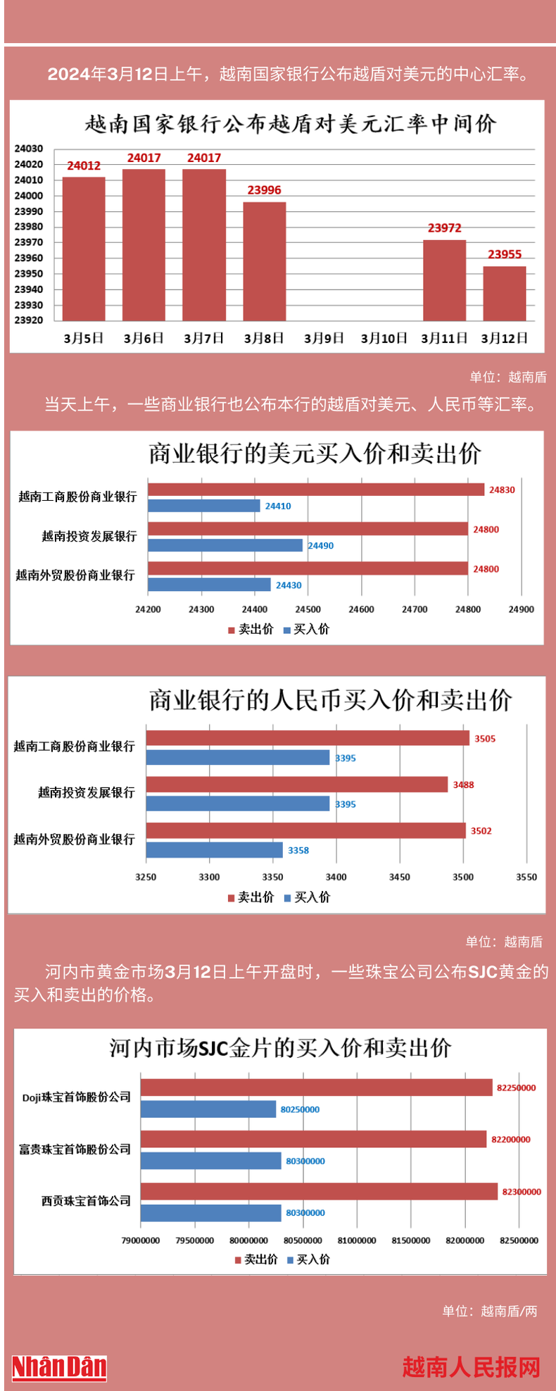 2024年3月12日上午,越南国家银行所公布的越盾对美元的中心汇率为23955。