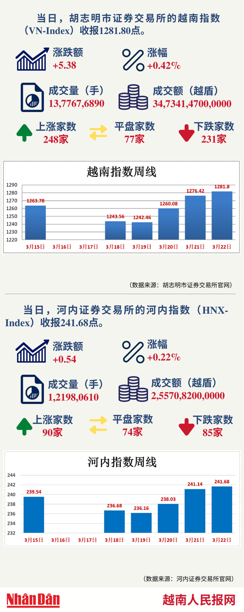 当天,胡志明市证券交易所的越南指数(VN-Index)和河内证券交易所的河内指数(HNX-Index)分别收报1281.80点和241.68点。