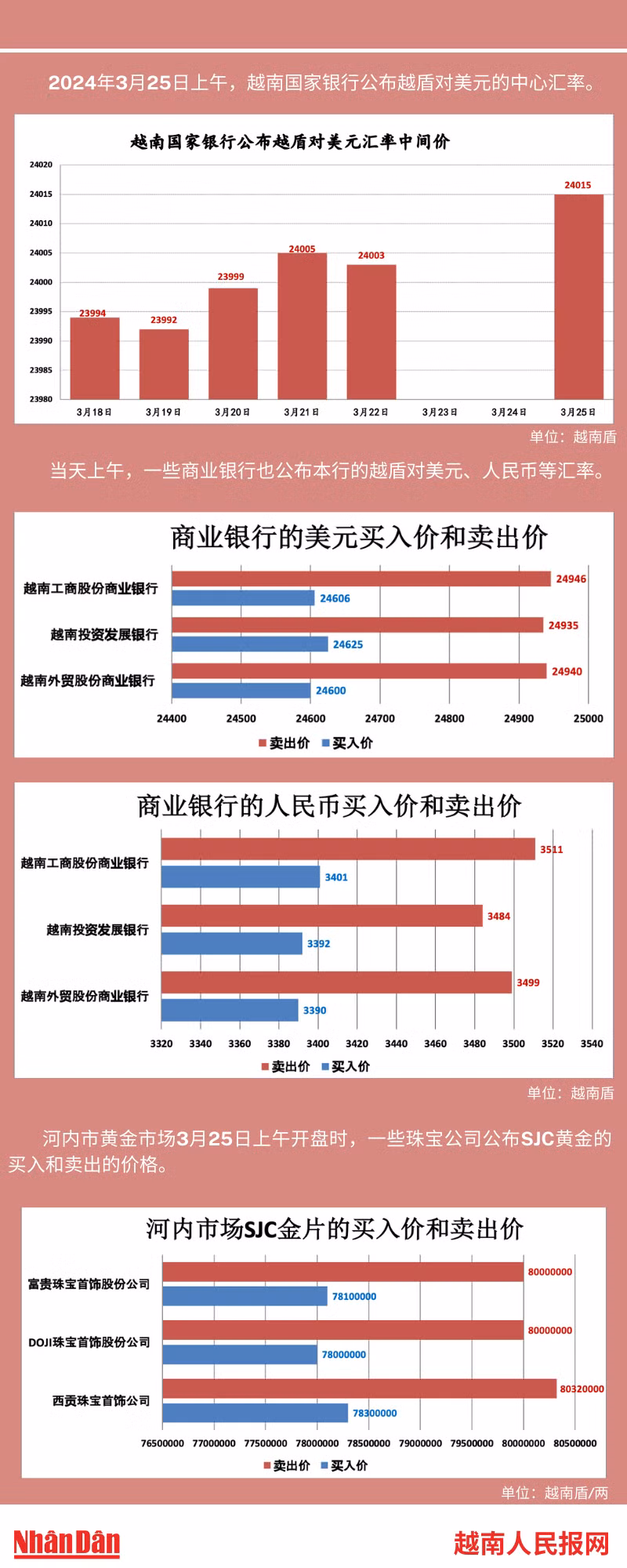 2024年3月25日上午,越南国家银行所公布的越盾对美元的中心汇率为24015。