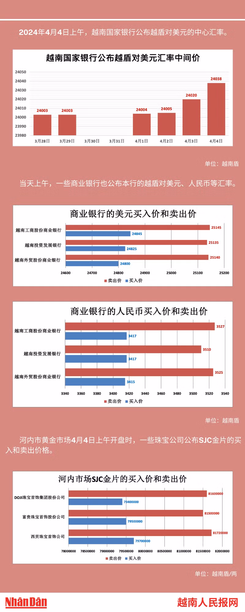 2024年4月4日上午,越南国家银行所公布的越盾对美元的中心汇率为24038。
