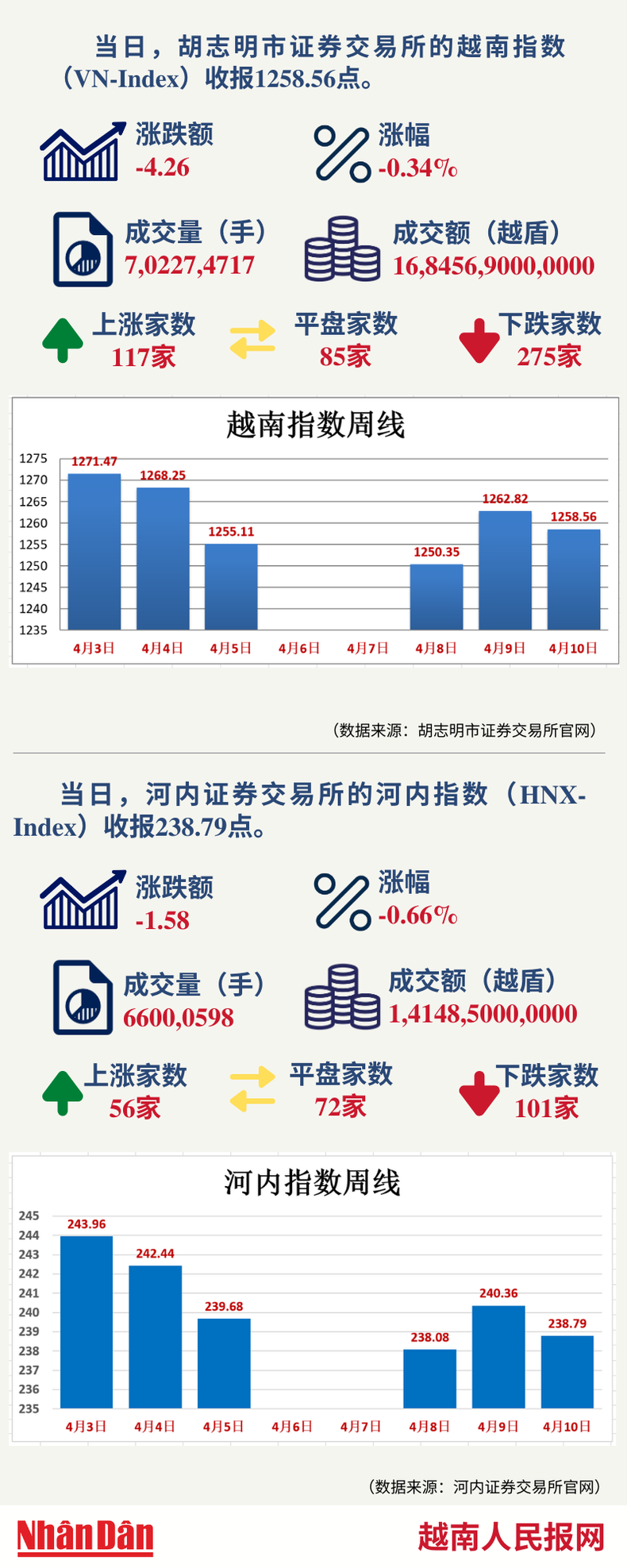 当天,胡志明市证券交易所的越南指数(VN-Index)和河内证券交易所的河内指数(HNX-Index)分别收报1258.56和238.79点。