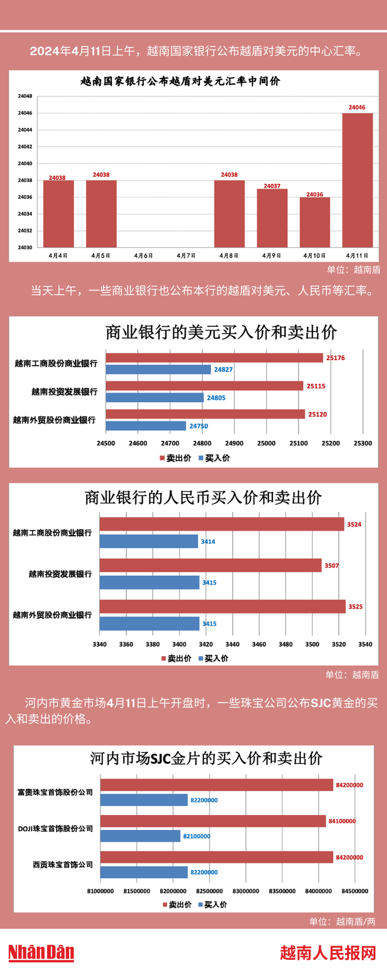 2024年4月11日上午,越南国家银行所公布的越盾对美元的中心汇率为24046。