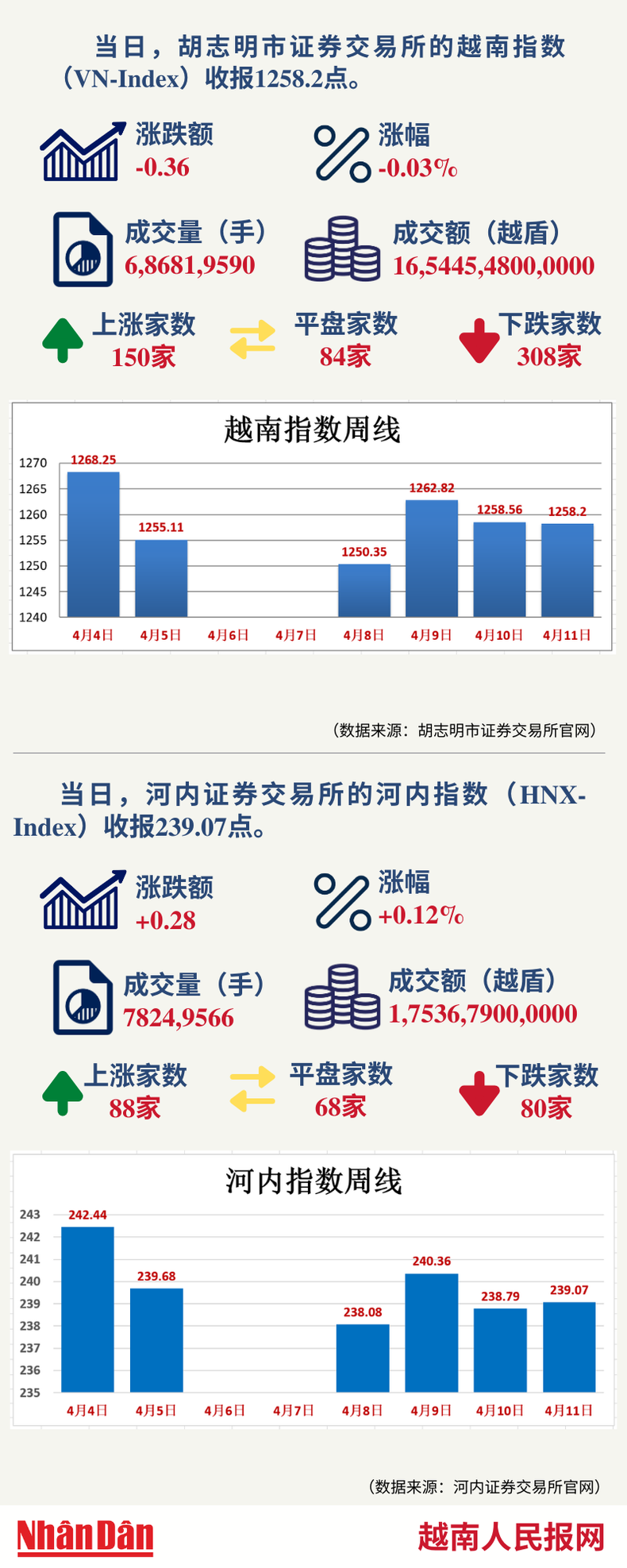 当天,胡志明市证券交易所的越南指数(VN-Index)和河内证券交易所的河内指数(HNX-Index)分别收报1258.2和239.07点。