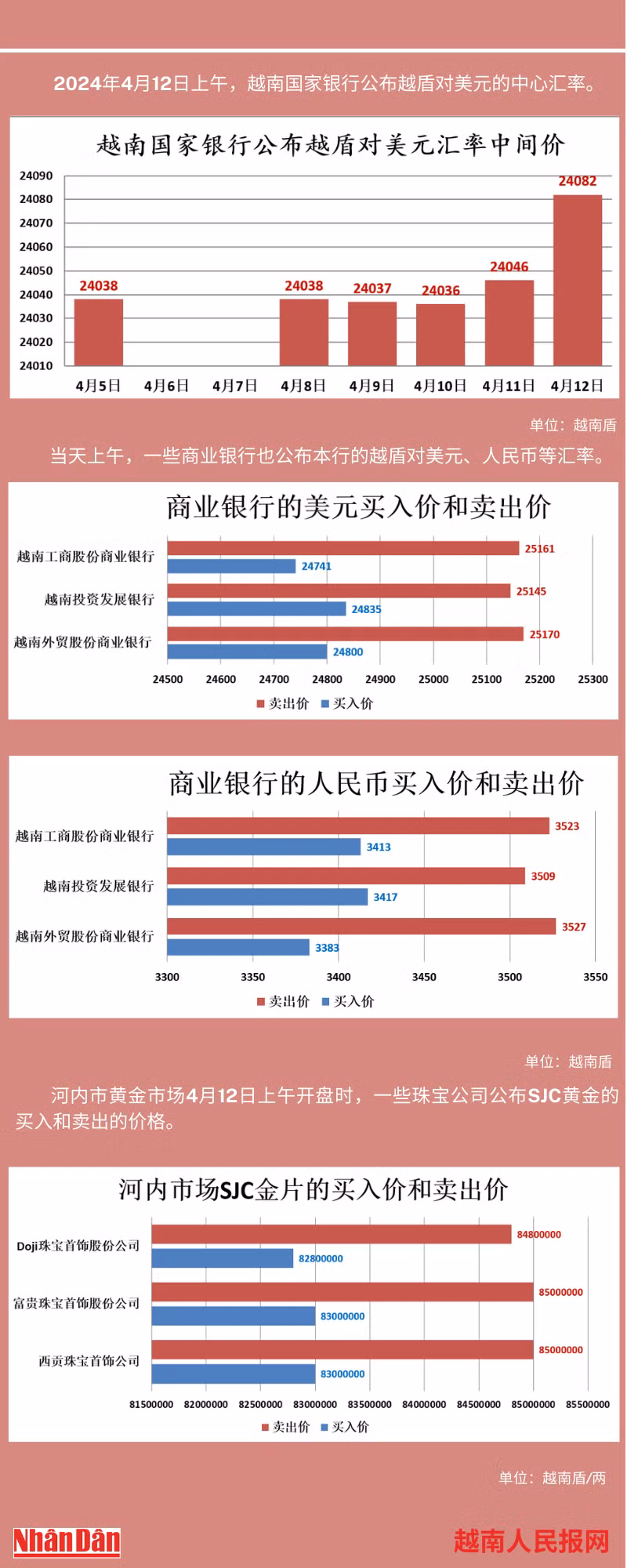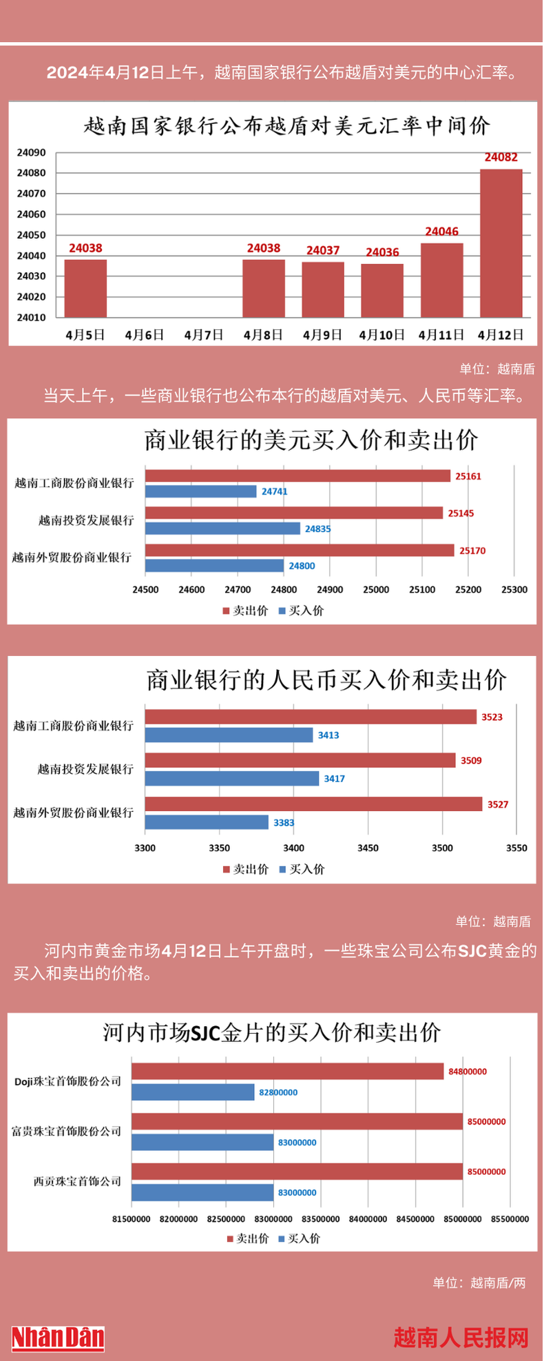 2024年4月12日上午,越南国家银行所公布的越盾对美元的中心汇率为24082。